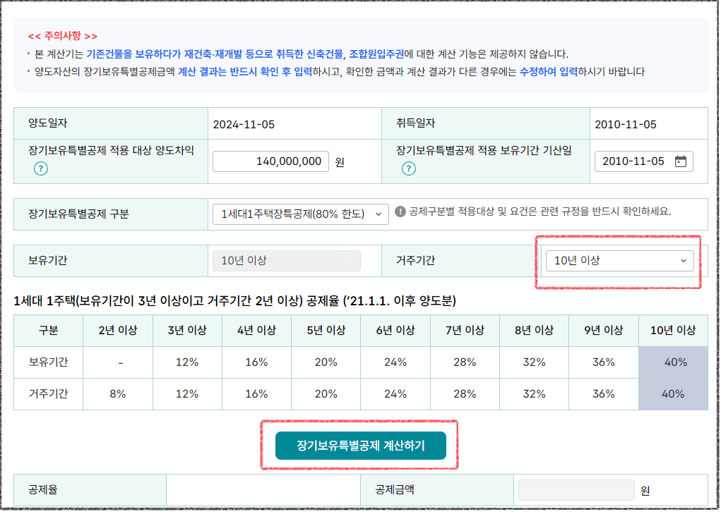 7. 장기보유특별공제 클릭하여 거주기간 선택하기 (보유기간과 거주기간이 다를 경우도 가능하니 거주기간만 선택해 주세요.)