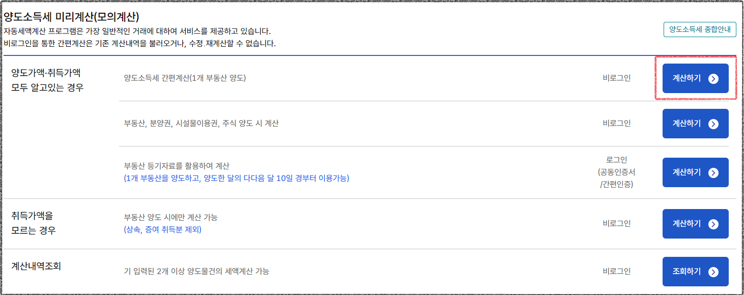양도소득세 계산기 사용방법 - 홈택스