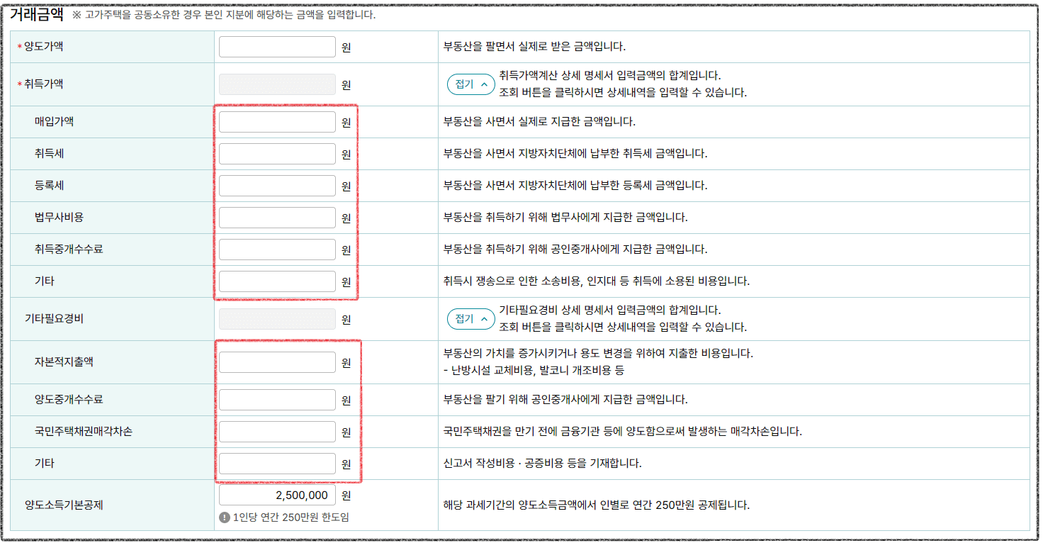 5. 취득가액과 필요경비 : 펼침을 눌러 디테일한 금액을 아는 경우 입력